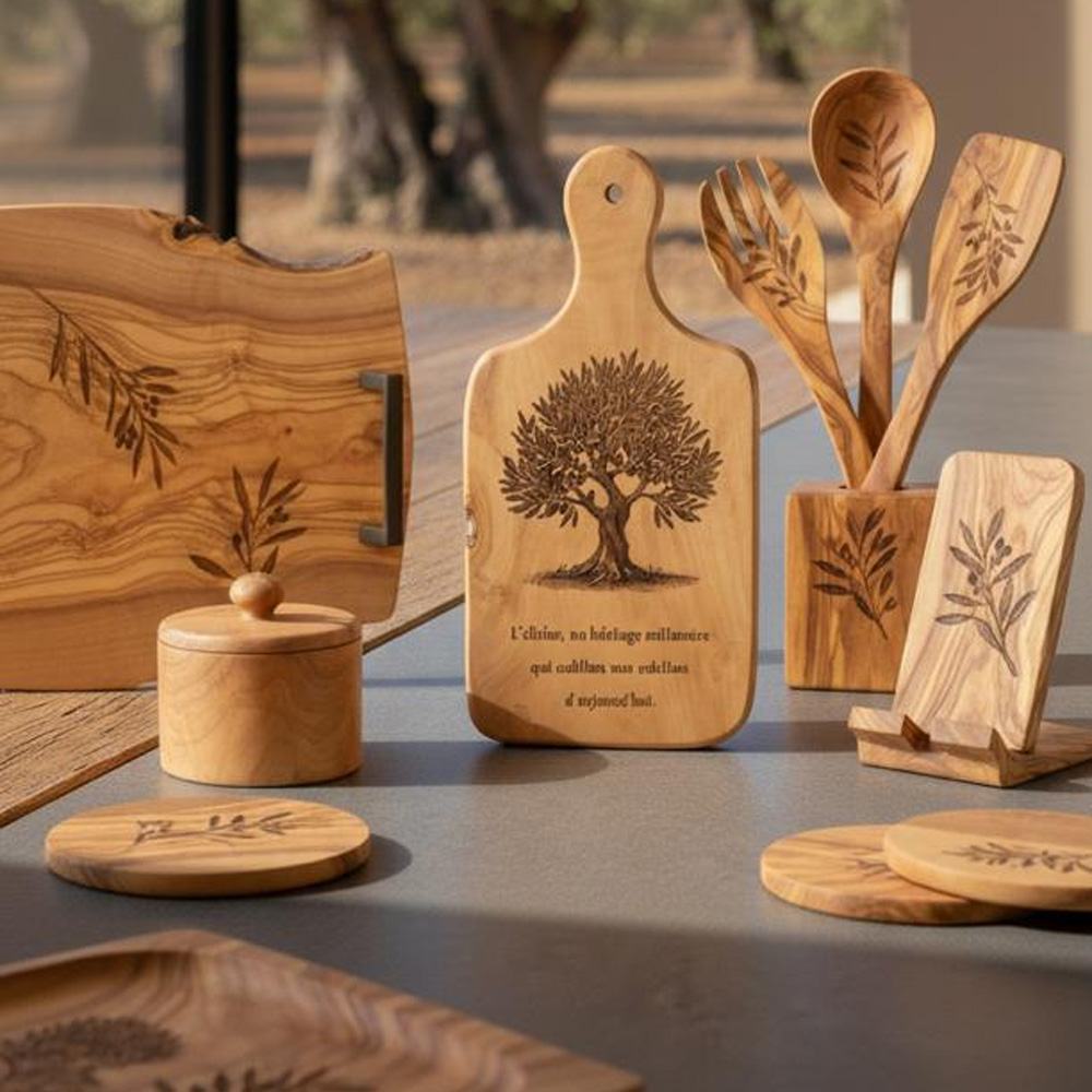 Articles gravés en bois d’olivier, alliant authenticité, élégance et durabilité. Chaque pièce est unique grâce aux veines naturelles du bois et à une gravure soignée, idéale pour un usage quotidien ou un cadeau raffiné.